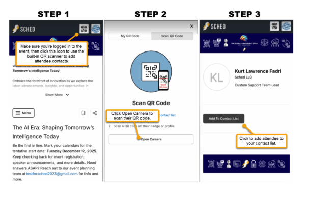 - Use your phone to scan another attendee’s, sponsor’s, or other user’s QR code.